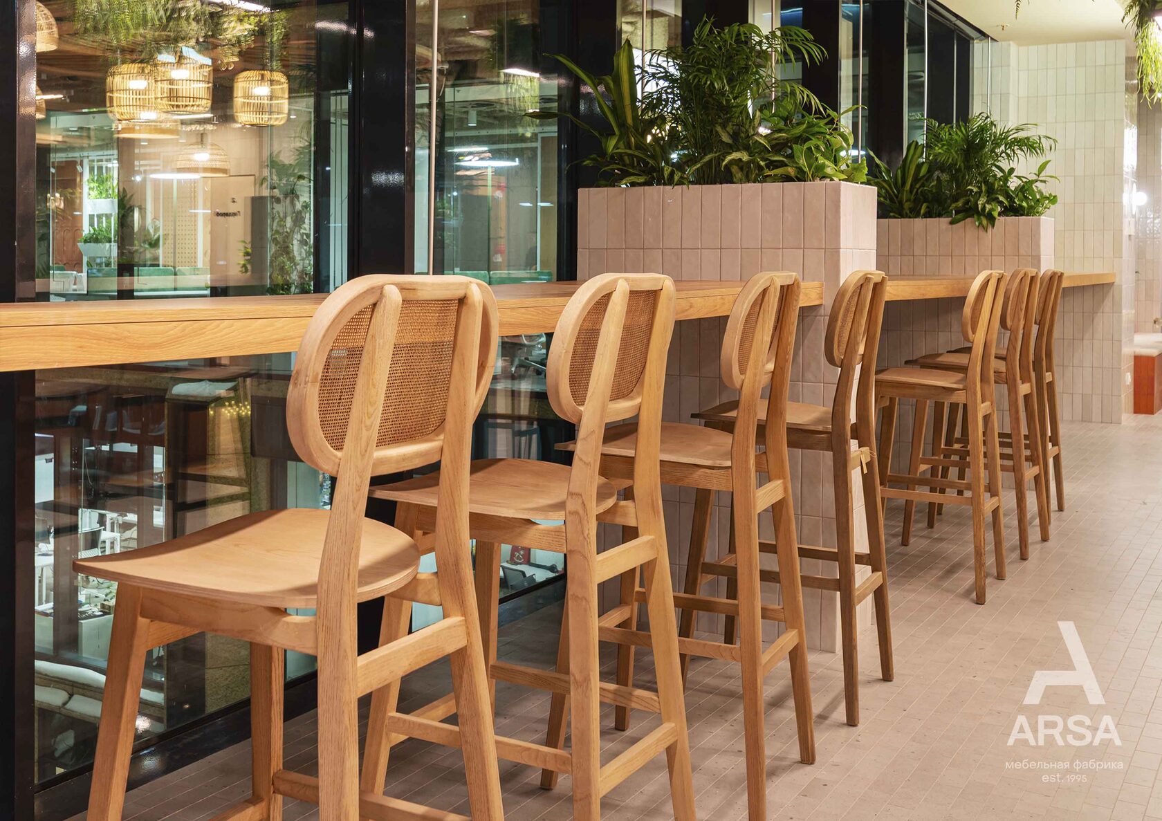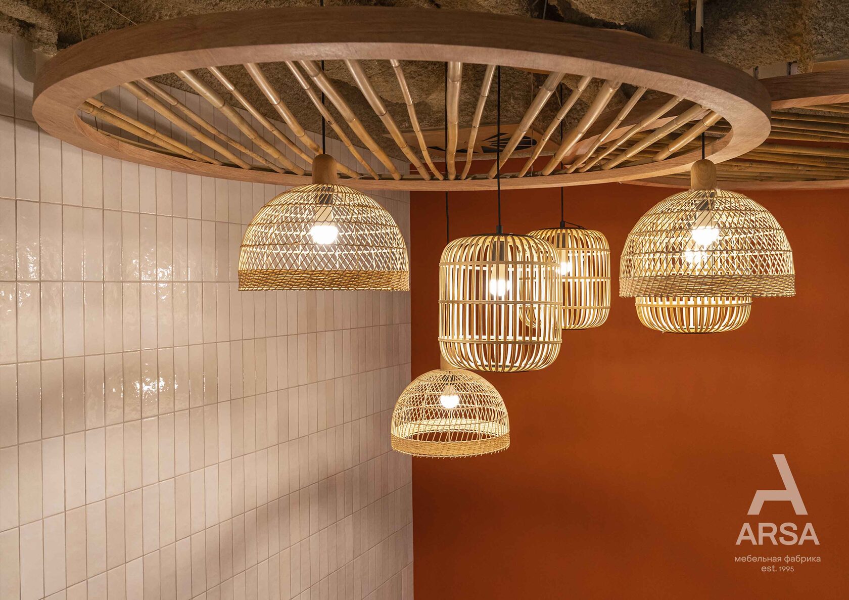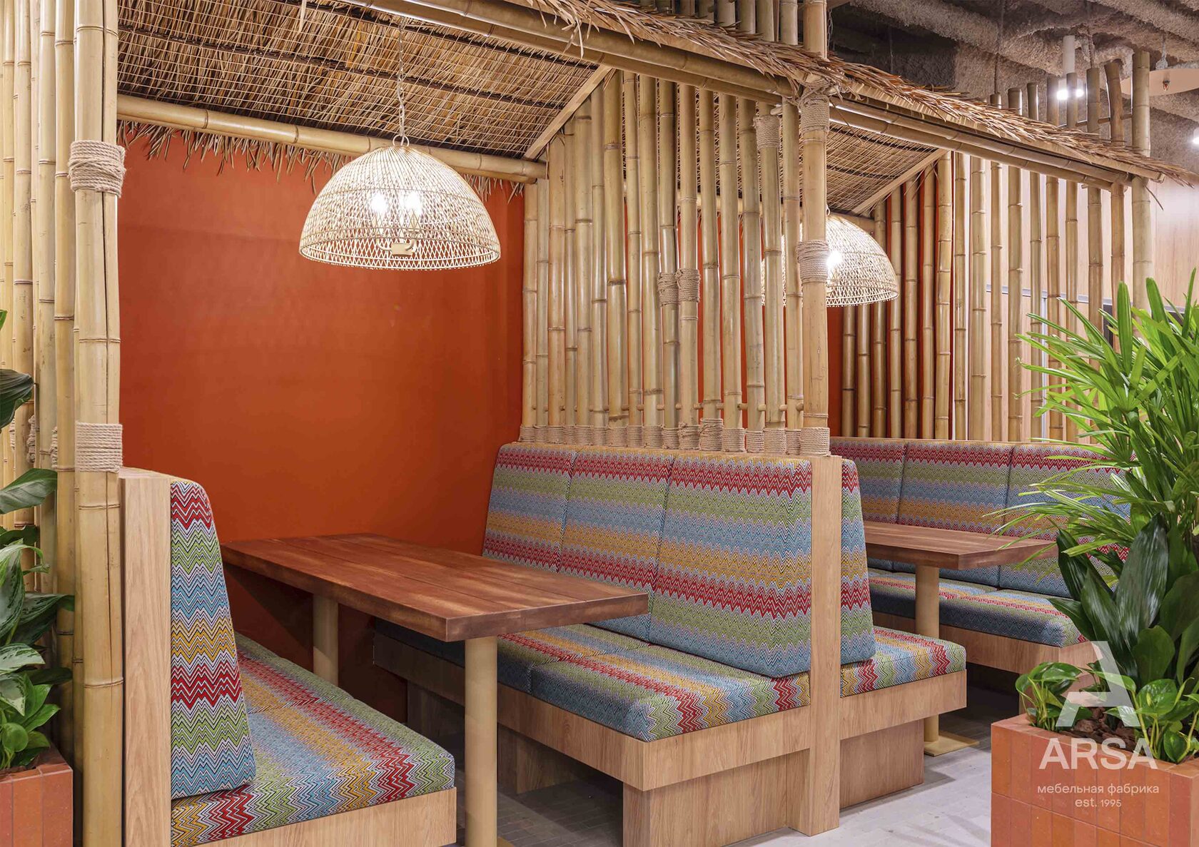 стволов бамбука,скрученных джутовыми канатами, и увенчанных соломеннои крышей. Декоративная стена с нишами за баром, выполнена в отделке под